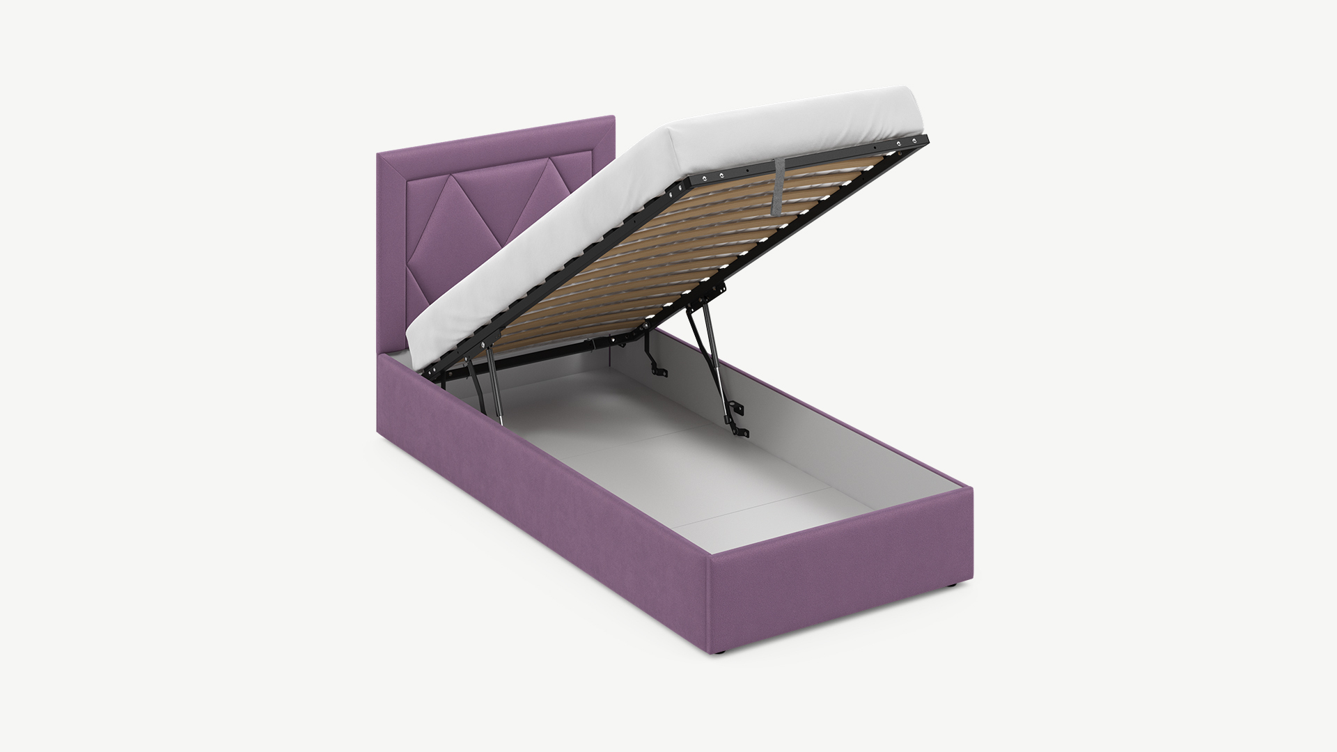 • Скрытая под основанием вместительная емкость без внутренних перегородок позволяет использовать всю площадь подкроватного пространства для хранения вещей.