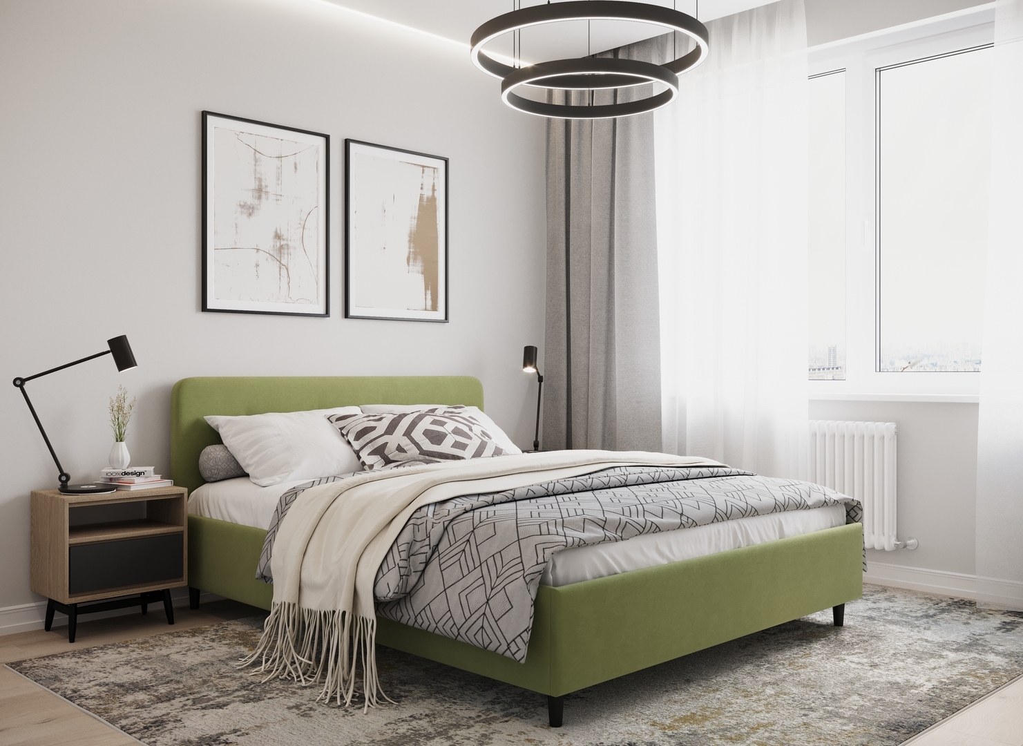 Царга, задающая пропорции, благодаря гладкости своей фактуры подчеркивает центральный элемент декора. Высокие опоры приподнимают фигуру кровати над полом и добавляют её образу визуальной легкости.