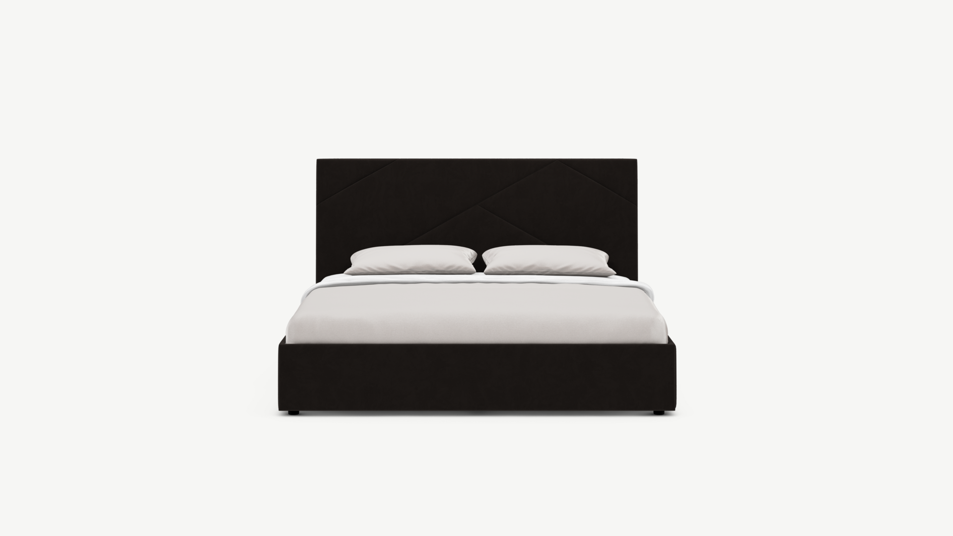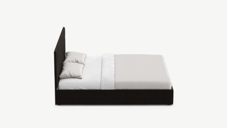 MOON FAMILY 1257 привлекает внимание оригинальным исполнением: широкие полосы ткани эффектно пересекают периметр изголовья, создавая на нем графический орнамент. Элегантным и практичным акцентом служат скрытые карманы, расположенные по его углам. Лаконичные формы объемных царг создают единый гармоничный образ и фокусируют внимание на центральном текстурном элементе кровати.