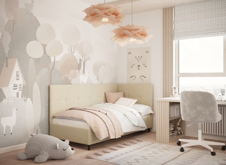 Угловая односпальная кровать MOON FAMILY 1261 с мягкой спинкой и изголовьем создаст в Вашей спальне ощущение уюта. Крупная квадратная стежка привносит в интерьер графических акцентов, а вставка из пуговиц наполняет пространство ощущением домашнего тепла.