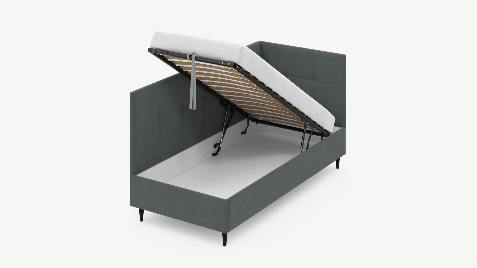 • Скрытая под основанием вместительная емкость без внутренних перегородок позволяет использовать всю площадь подкроватного пространства для хранения вещей.