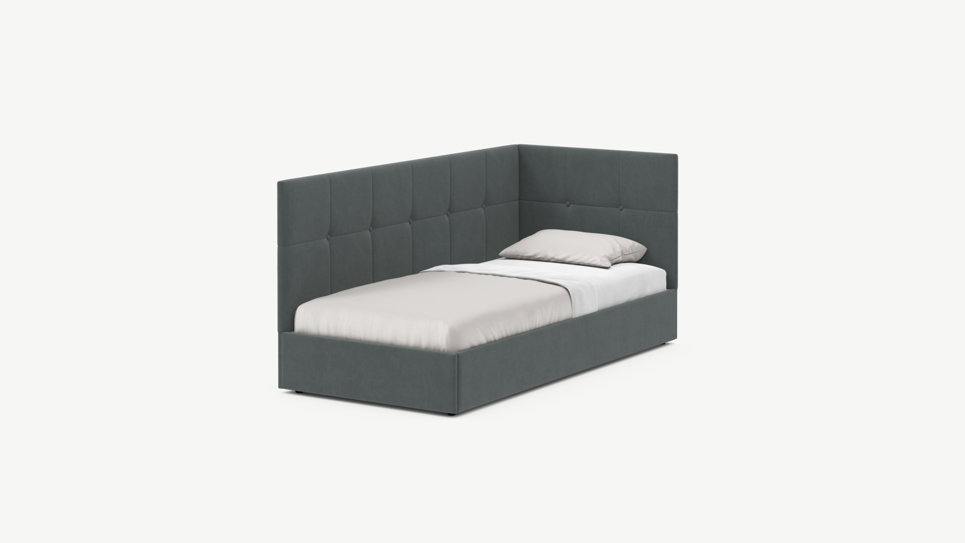 Угловая односпальная кровать MOON FAMILY 1261 с мягкой спинкой и изголовьем создаст в Вашей спальне ощущение уюта. Крупная квадратная стежка привносит в интерьер графических акцентов, а вставка из пуговиц наполняет пространство ощущением домашнего тепла.