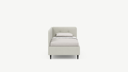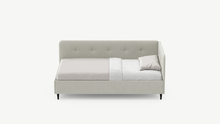 Угловая односпальная кровать MOON FAMILY 1253 с мягкой спинкой и изголовьем обладает округлыми формами, привносящими в интерьер нотки нежности. Изголовье, украшенное пуговицами, добавляет окружающему пространству шарм и уют. Высокие опоры придают кровати визуальной легкости, а также обеспечивают удобство во время уборки.